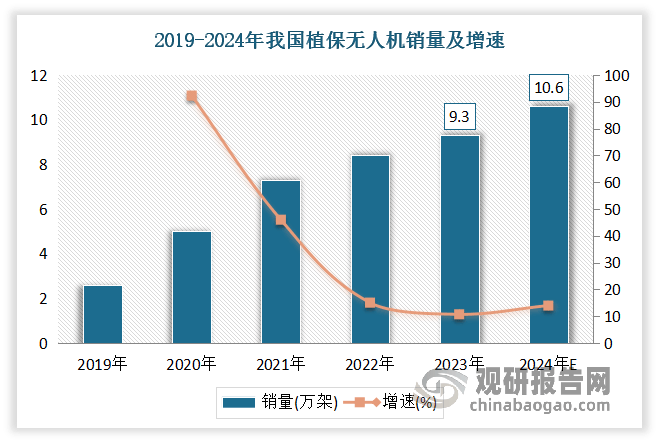 近年跟着科技的飞速成长,植保无人机正成为农业范畴的抢手话题。做为现代农业手艺的新兴代表,植保无人机凭仗其经济、环保等劣势,逐步获得了泛博农人伴侣和农业企业的承认。按照数据,2023年我国植保无人机销量达9。3万架,估计2024年我国植保无人机销量达10。6万架,较上年同比增加13。98%。