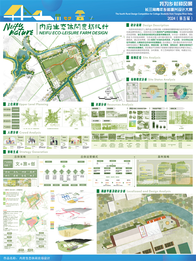正在巡展勾当的第一坐新义村内府农业,一幅引见了《内府生态休闲农场设想》的海报做品吸引了村平易近的留意。内府休闲农场位于枫泾镇,次要种植猕猴桃和葡萄,但成长模式零星,缺乏系统性的规划和运营筹谋。青年团队颠末15天驻场调研,梳理了农场的天然资本、财产劣势、文化特色和市场需求,针对内府农业提质升级需求进行立异设想,提出了农业参不雅、蔬果采摘、亲子教育、宠物敌对、露营住宿体验于一体的全方位、多条理的现代休闲农场体验系统,团队还设想出次要建建平面图以及农场视觉导览。“次要分三期开辟,以营地、餐饮、研学、去野、发蒙、建立‘文+旅+创’IP。”。