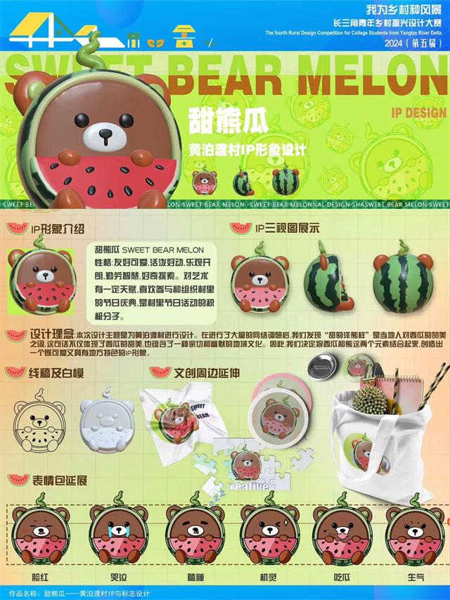 做为一项笼盖长三角地域的设想竞赛,来自六安霍邱黄泊渡村的村牌门头和IP抽象打制两个需求点位也收成浩繁优良设想方案。《浆韵瓜乡》做品的设想团队正在走访调研时发觉村口没有临街节点,村内也没有标记景不雅小品。正在领会到黄泊渡村的汗青取现代特色后,他们提取了渡口、水波、西瓜等元素,打制了徽派建建气概的特色门牌。“好比门头左侧以船桨为元素,意味黄老伯及村平易近的勤奋取勤奋。底部的木条和衡宇图案代表古时黄泊渡的船厂和渡口,展示村庄的汗青文化。左侧的西瓜图案凸起的是现代黄泊渡的支柱财产,以西瓜种植带动村庄的经济成长,船锚又取船桨相呼应,寄意着村庄正在安定的汗青根本上,正稳步驶向现代化的将来。”而《甜熊瓜》IP抽象设想也是以黄泊渡的支柱财产西瓜为切入点,以其憨态可掬、色彩明显的甜熊瓜抽象收成了一众好评。