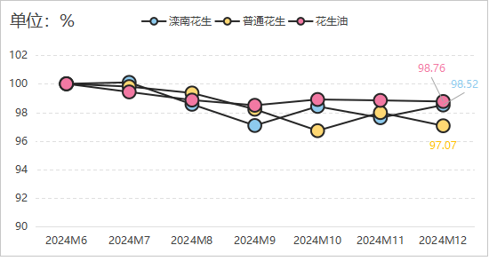 供给方面,2024/2025产季我国花出产量同比持平,叠加陈季花生结转库存,全体来看,花生根基面延续供需宽松款式。跟着春节假期临近,农户和经销商出货心理松动,农户惜售情感有所缓解,产区供给总体优良,供强需弱特征仍然较着。跟着各购销从体收购进入尾声,节前市场很难构成买卖高峰,市场买卖量将逐步缩减。需求方面,市场需求仍然较弱。一方面市场决心遍及不脚,油脂期货价钱遍及处于低位,采购商将连结择价按需采购为从,市场价钱跟涨难度较大,但花生期货目前价钱有所回升,后期市场决心预期改善。另一方面,近期油厂到货平稳,限量收购,跟着春节到来,油厂将连续颁布发表停机、停收,货源耗损渠道将会愈加单一,降低购销两边的入市热情。估计除夕后国内花生市场将维持区间盘桓行情,难以形成趋向性上涨。进出口方面,海关数据显示,2024年12月,中国花生进口量37291。69吨,出口量18098。4吨,较11月有所下降。2024年中国全年花生累计进口759514。35吨,同比增加14。93%;全年花生累计出口144617。56吨,同比增加37。11%。同时本年度以来,目前价钱取2021年雷同,较岁首年月走弱500美元/吨摆布。从目前察看来看,美国、印度、阿根廷和巴西花生均实现减产,2025年国际花生估计价钱继续承压。分项产物价钱指数方面,三大分项指数呈现“一涨一平一跌”,此中滦南花生价钱指数呈现小幅回升,12月指数值为98。52点,环比增加0。91%;花生油价钱指数连结平稳运转,指数值为98。76点;通俗花生价钱指数小幅下滑,12月指数值环比下降0。94%至97。07点。分项指数具体走势见下图: