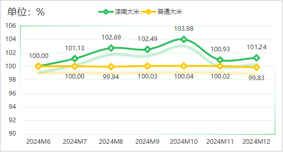 国际市场方面,结合国粮农组织(FAO)数据显示,2024年12月份全球大米价钱指数环比下跌1。2%。大米次要出口国米价均有小幅下滑,截至2024年12月末,泰国5%破裂率大米FOB报价501美元/吨,越南5%破裂率大米FOB报价485美元/吨,巴基斯坦5%破裂率大米FOB报价452美元/吨,印度5%破裂率大米FOB报价449美元/吨。跟着印度卢比贬值至汗青低点,印度大米出口价钱进一步下跌,大米出口商的利润被无效提高。相较于东南亚地域出口米价不竭下降,日本米价则再立异高,日本农林水产省数据显示,2024年12月日本新米买卖价钱创下汗青新高,所有品种、用于从食的大米发卖给批发商的价钱是客岁同期的1。6倍,达每60公斤24665日元(约合人平易近币1162元),每公斤大米折合人平易近币价钱跨越19元。总体上看,国际大米到岸税后价仍高于国内,中国农业消息网数据显示,12月份,配额内1%关税下泰国大米到岸税后价每斤2。1元,比国内晚籼米批发价每斤高0。06元;离岸价折人平易近币每斤1。8元,比国内低0。24元。我国大米进口量同比大幅下降,海关数据显示,2024年全年,我国累计进口大米166万吨,同比下降37。1%;累计进口额67。95亿元,同比下降32。5%。大米出口同样呈现下降趋向,海关数据显示,2024年全年,我国累计出口大米111万吨,同比下降30。8%;累计进口额45。22亿元,同比下降28。2%。此中12月份,我国大米进口38万吨,同比增加63。9%,同比增加44。0%;大米出口5万吨,同比下降73。9%,出口额1。97亿元,同比下降75。4%。国内市场方面,12月份以来,南方地域中晚稻收购渐入尾声,稻谷托市收购无力有序推进,对不变市场价钱阐扬了环节感化,中晚籼稻收购价维持平稳,粳稻大量上市,阶段性供大于需,收购价稳中偏弱运转。优良粮价钱仍较有劣势,国度粮油消息核心数据显示,2025年1月8日江西“黄华占”(优良稻谷)收购价2900元/吨,高于通俗中晚籼稻收购价310元/吨;湖南“黄华占”收购价2800元/吨,高于通俗中晚籼稻收购价180元/吨。分项产物价钱指数方面,滦南大米价钱指数回升,2024年12月指数上行至101。24点,此中散拆滦南大米价钱指数维持正在103。50点平稳运转;包拆滦南大米价钱指数有所回升,指数值为98。98点,环比增加0。64%。通俗大米价钱指数走弱,12月指数值为99。83点,此中籼米取粳米价钱指数均有小幅下滑,指数值别离为99。62点和100。31点。分项指数具体走势见下图: