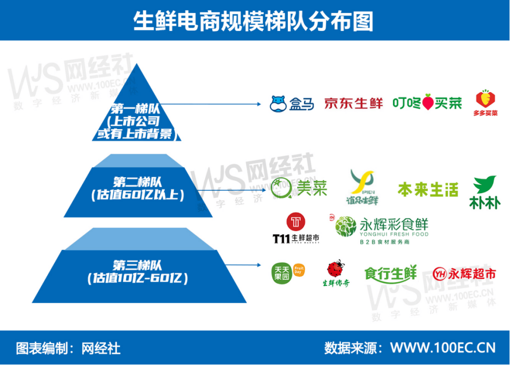 目前,生鲜电商曾经构成三个梯队。第一梯队为上市公司或有上市公司布景,包罗:叮咚买菜、盒马、京东生鲜、多多买菜;第二梯队为美菜网、永辉彩食鲜、本来糊口、T11生鲜超市、谊品生鲜、朴朴超市,估值跨越60亿人平易近币;