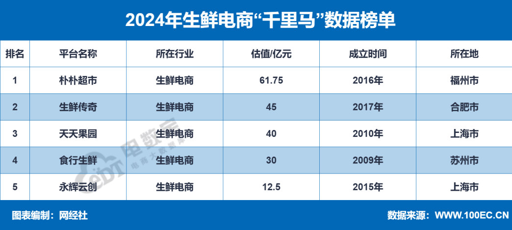 2024年生鲜电商“千里马”5家,别离是朴朴超市、生鲜传奇、天天果园、食行生鲜、永辉云创,估值别离为61。75亿元、45亿元、40亿元、30亿元、12。5亿元,总估值达189。25亿元。