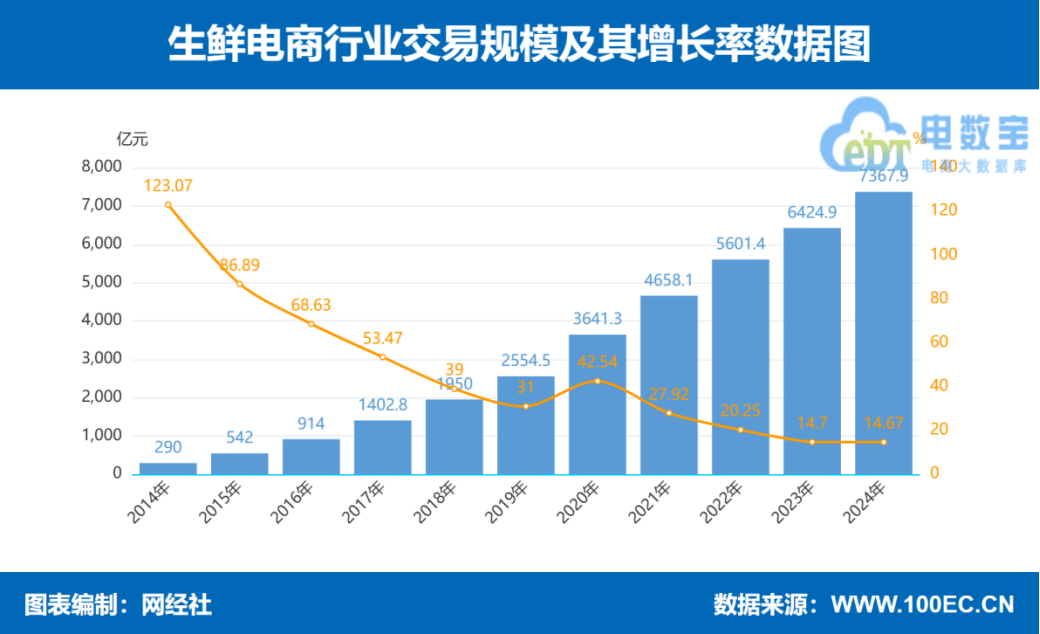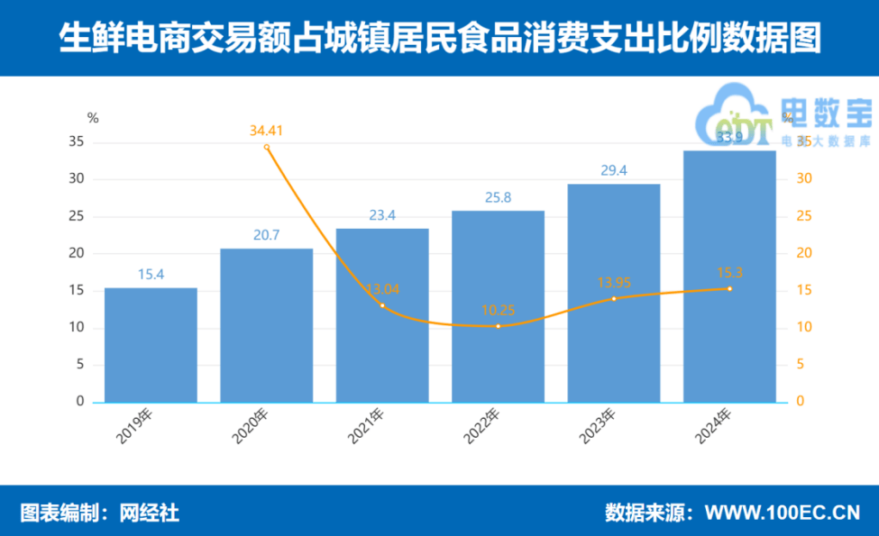 据“电数宝”显示,2024年城镇居平易近食物消费收入为21737亿元,生鲜电商买卖额占城镇居平易近食物消费收入的比例为33。9%。