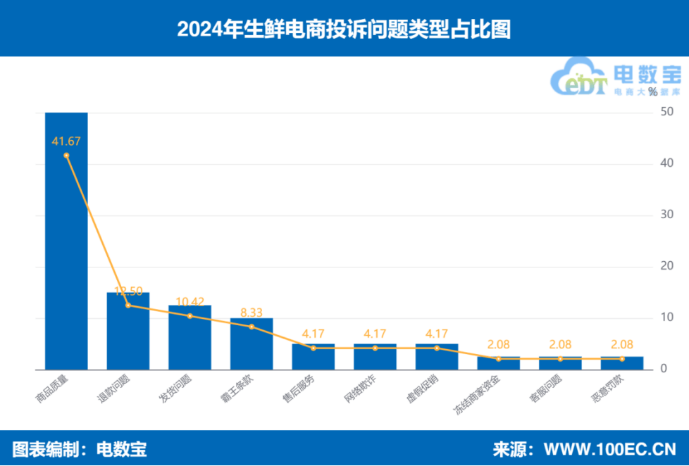 收集消费胶葛调整平台“电诉宝”受理用户案例显示,商质量量、退款问题、发货问题、霸王条目、售后办事、收集欺诈、虚假促销、冻结商家资金、客服问题、恶意罚款等是2024年生鲜电商赞扬的次要问题。