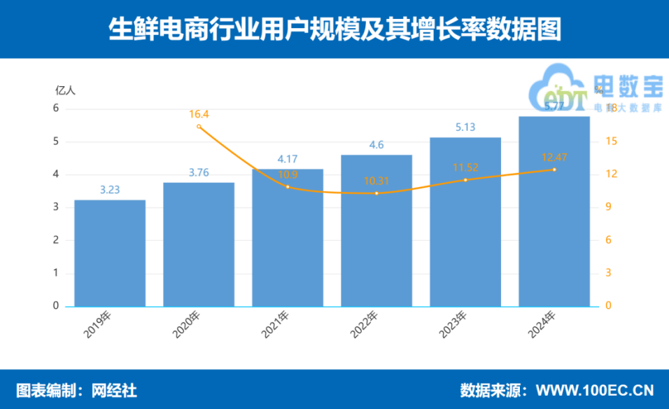 “电数宝”显示,2024年生鲜电商行业用户规模为5。77亿,同比增加12。47%。反映消费者对生鲜电商的接管度提高。2019年至2023年用户规模别离为:3。23亿、3。76亿、4。17亿、4。6亿、5。13亿。