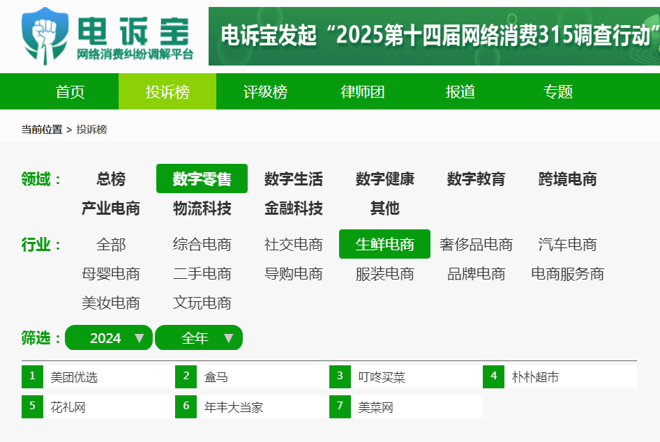 据收集消费胶葛调整平台“电诉宝”显示,2024年根据赞扬量来排名,涉及的生鲜电商平台有美团优选、盒马、叮咚买菜、朴朴超市、花礼网、年丰大当家、美菜网。
