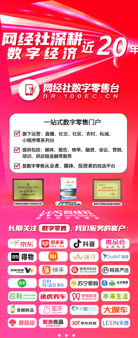 网经社深耕数字经济行业18年,持久关心数字零售,旗下数字零售台办事的客户有:京东、拼多多、抖音、快手、唯品会、遥望、谦寻、达达集团、小米、得物、网易严选、苏宁易购、什么值得买、返利网、途虎养车、梦饷科技、本来糊口、奇麟鲜品、京东科技、蜜芽、美囤妈妈、乐信、大搜车、瓜子二手车、蘑菇街、聚美优品、无忧传媒、菜鸟等。