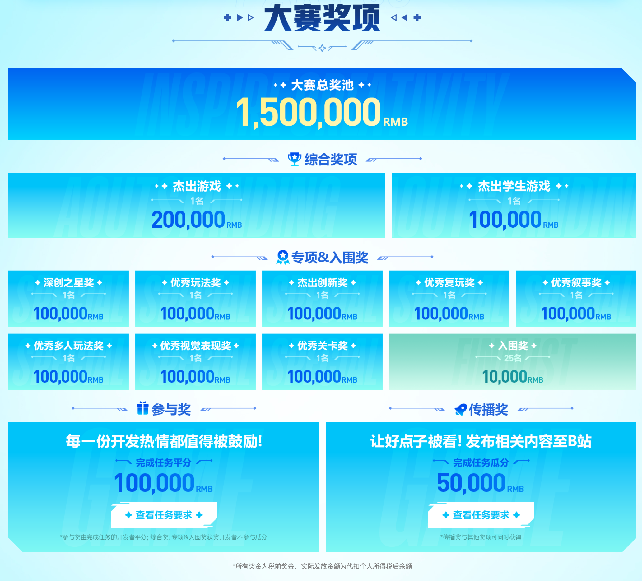 除了最高可达20万元金的单项,大赛还设置了“入围”、“参取”、本次赛事参赛做品不限类型、气概,报名不设门槛,只需你热爱逛戏、有创意,这里就是展现的舞台!低门槛高效率的逛戏编纂器,共同丰硕的专业教程,即便零代码根本也能轻松参赛做逛戏。赛事共设立10个单项、25个入围,单项金最高可达20万元(税前)。大赛同时设置了10万元参取池和5万元池。只需提交合适要求的做品,完成赛事使命,就能轻松瓜分参取金;而正在B坐发布相关创意内容,还能拿下最高8000元(税前)的金。